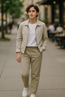 - Total look monochrome : Pantalon, haut et sneakers dans des nuances similaires (gris, bleu marine, beige) : effet chic et allongeant garanti.